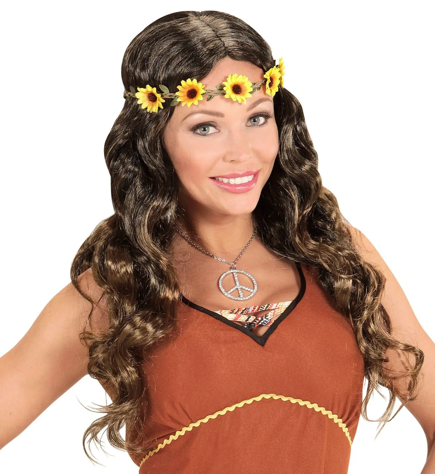 Curly Carla Pruik Hippie Bruin Met Zonnebloem Hoofdband